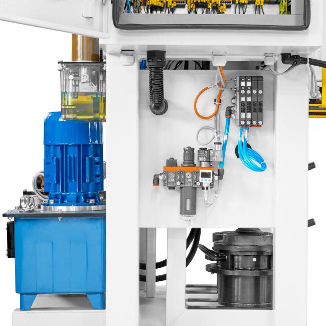 Elementy sterowania oraz wyświetlacz 7" calowy umożliwia podgląd procesu oraz sterowanie poszczególnymi ruchami maszyny. Na panelu wyświetlane są wszystkie ostrzeżenia i alarmy, liczniki detali oraz podgląd stanu wszystkich czujników maszyny.