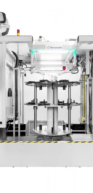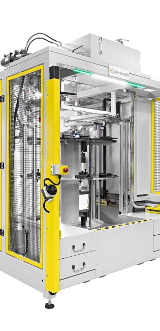 Sercem maszyny jest stół obrotowy, zbudowany na bazie wysokiej jakości serwonapędu Fibro o dokładności pozycjonowania +/- 30". Ze względu na różne długości amortyzatorów, możliwe jest dostosowanie wysokości środkowej płyty. Ruch góra-dół realizowany jest za pomocą siłownika elektrycznego. Pozycja zadawana jest z panelu operatorskiego oraz może być zapisana dla każdej referencji. Na górnej płycie stołu zamontowano specjalne chwytaki sprężynowe trzymające amortyzatory.